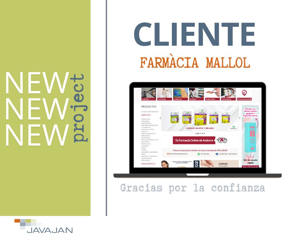 Para el equipo de Javajan está siendo muy gratificante trabajar con Farmàcia Mallol, gracias por la confianza, esperamos y deseamos que nuestra colaboración se alargue en el tiempo el máximo posible.